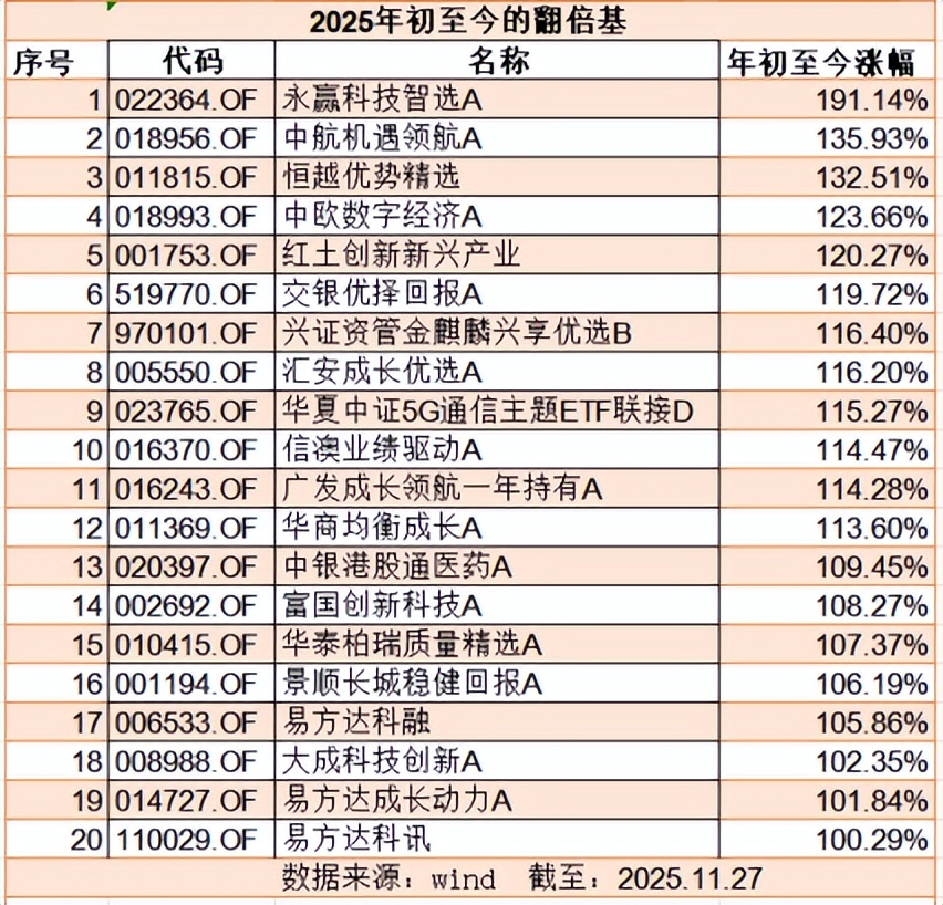 近期A股从4000点上方回撤,基金净值同步承压。截至11月27日收盘,年内翻倍基金仅剩20只,除1只港股通创新药基金外,其余19只均重仓人工智能产业链。