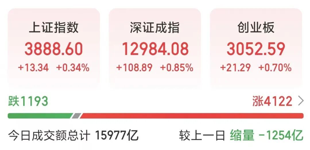今日A股三大指数呈现低开高走态势,午后维持红盘震荡格局。截至收盘,上证指数上涨0.34%,深证成指上涨0.85%,创业板指上涨0.70%。全市场超4100只个股飘红,全天成交额突破1.59万亿元。