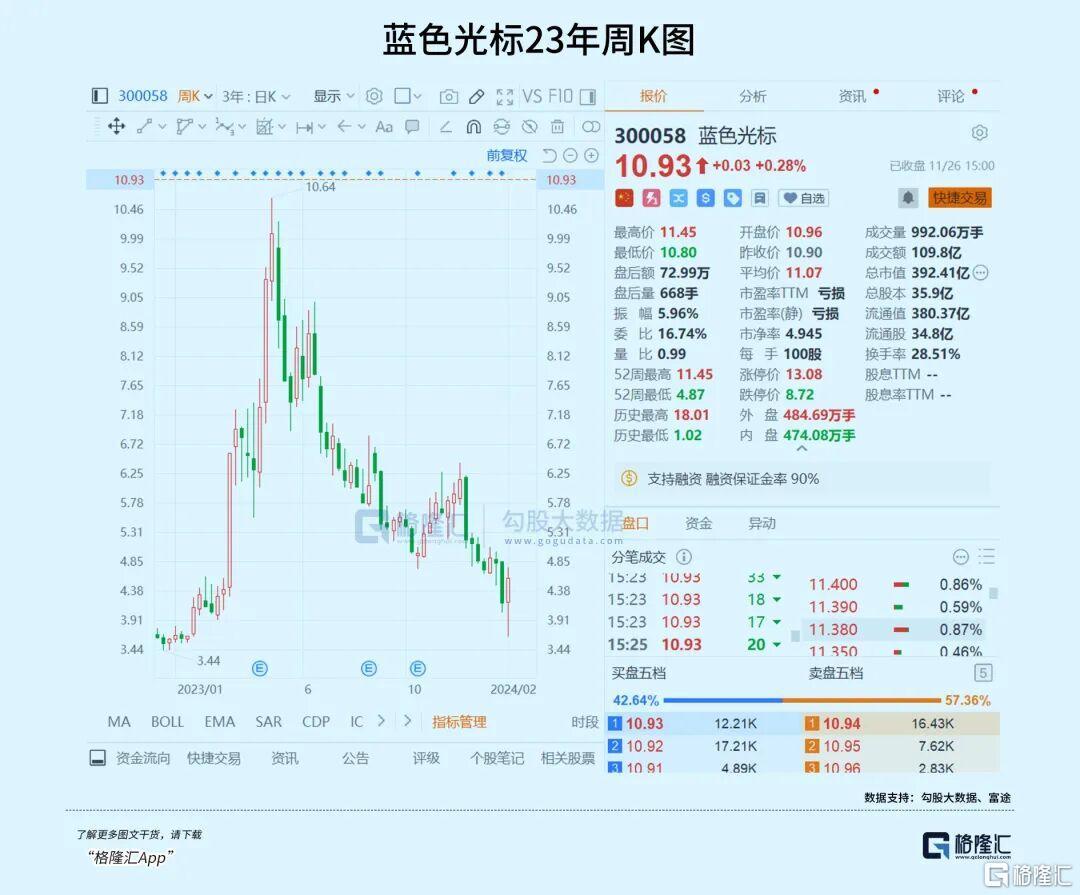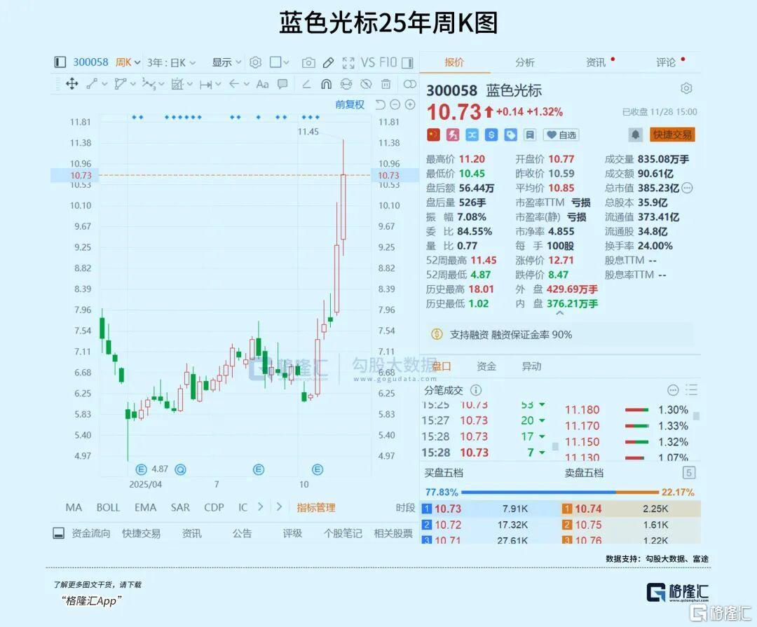 资本市场上,AI应用概念带动营销板块整体上扬。作为国内互联网广告营销先行者,蓝色光标自10月30日以来股价飙升超70%,年初至今已实现翻倍增长。