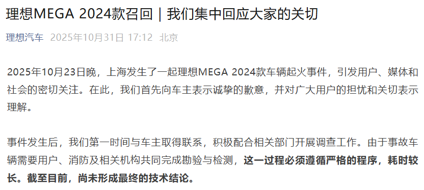 2025年10月23日,一辆理想MEGA在上海闵行区行驶时突发起火,10秒内火势蔓延至全车并最终烧毁,所幸驾驶员及时逃生。此次事故引发理想MEGA的大规模召回,涉及车辆达1.14万辆,召回原因是冷却液防腐性能不足,可能导致冷却铝板腐蚀渗漏,极端情况下引发电池热失控。