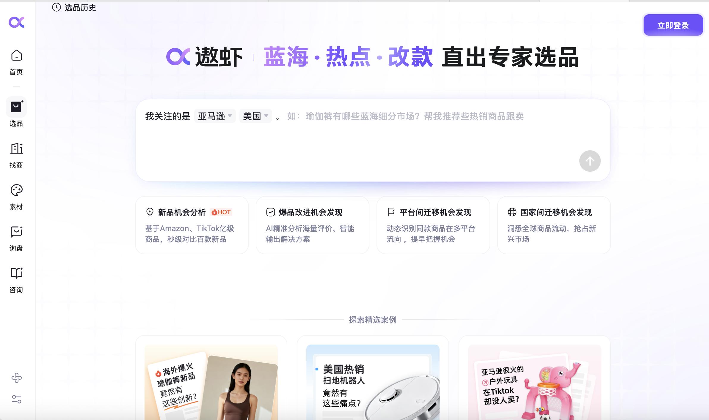 打开电商AI智能体“遨虾”的官网,页面简洁直观,用户无需学习复杂操作,只需在对话框中用自然语言描述需求,或直接上传商品图片、粘贴海外热销商品链接即可。之后,AI会接手后续工作:分析市场、匹配工厂、生成素材,甚至代为询价,用户最终只需确认下单和付款。
