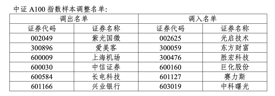 中证A100指数更换6只样本股,东方财富、光启技术、中科曙光等个股进入指数,上海机场、紫光国微、中信证券等被移出。