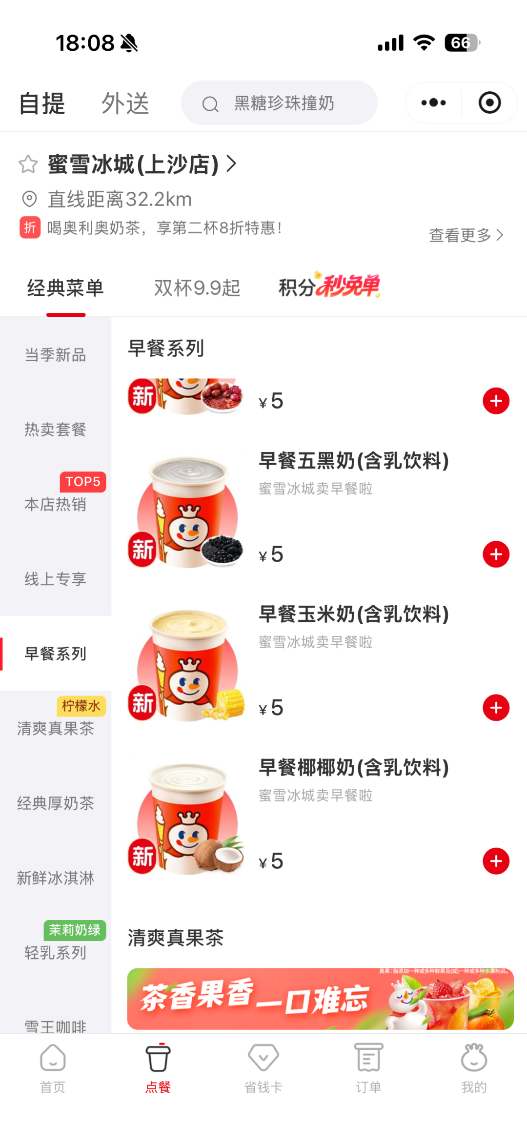 茶咖观察通过蜜雪冰城官方小程序验证,发现杭州上沙店已上线“早餐系列”,包含早餐五红奶、五黑奶、玉米奶和椰椰奶四款,售价均为5元,与爆料信息吻合。