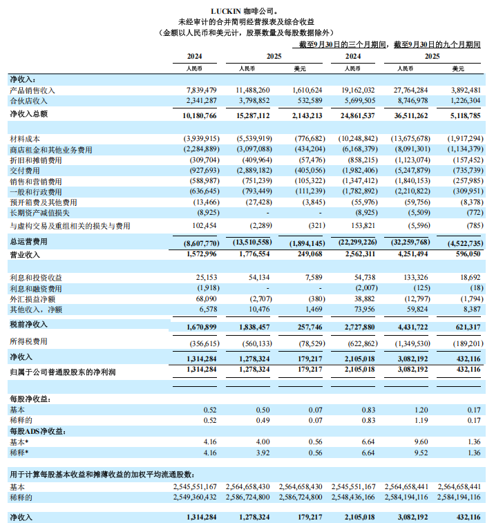 瑞幸咖啡第三季度的财报或许能让我们从数据中了解这场大战的真实影响。该季度,瑞幸实现营收152.9亿元,同比增长50.2%;门店数量单季净增3008家,总数超过2.9万家。然而,在高增长的背后,成本压力也随之而来。总成本同比上涨57%,达到135亿元,其中配送费用的涨幅尤为突出,暴涨211.4%,高达28.9亿元。受此影响,净利润同比下降2.74%,为12.8亿元。