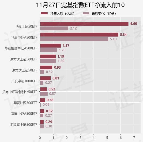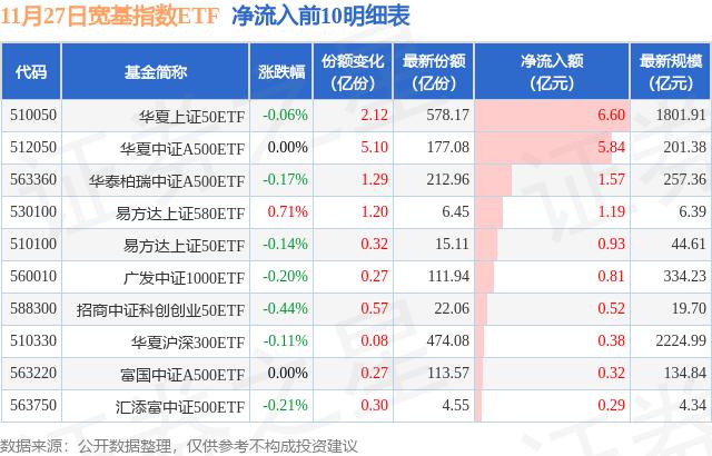 具体到单只基金,11月27日当天有29只宽基指数ETF基金获得资金净流入,其中华夏上证50ETF(510050)表现突出,占据净流入首位,其份额增加了2.12亿份,对应的净流入额为6.6亿元。