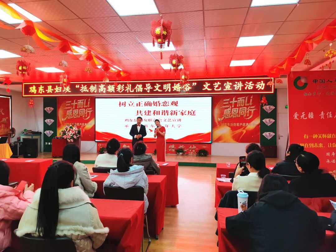 鸡东县妇联的工作人员向参与活动的群众发放文明婚俗宣传单,呼吁大家树立“以零彩礼为荣、不重彩礼重幸福”的婚恋观念,鼓励大家积极成为文明婚俗的倡导者、践行者与推动者,为促进“零彩礼”实践落实、构建和谐幸福的新鸡东注入了强大的精神动能。