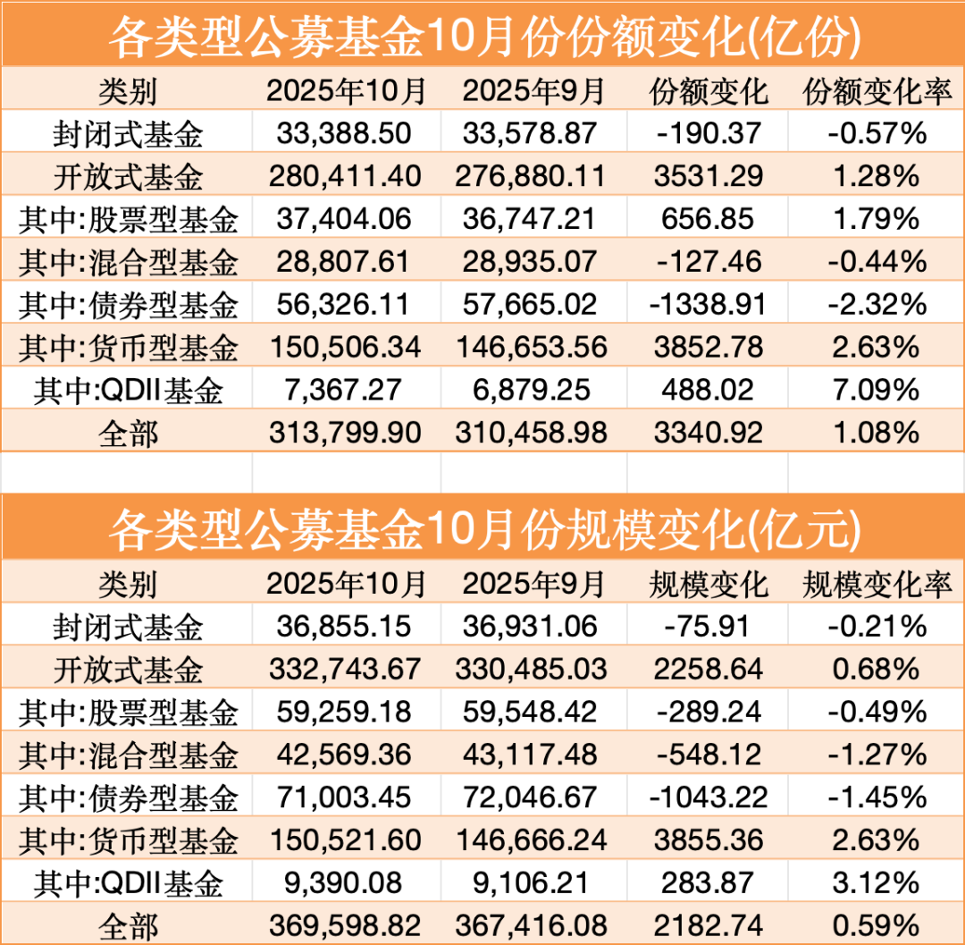 三季度末过后,部分机构资金在10月重新流入货币基金,推动货币基金规模增长3855.36亿元,环比增幅达到2.63%。