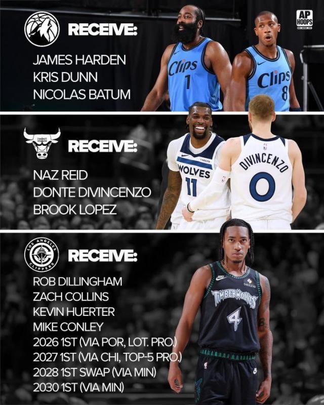 快船得到:迪林厄姆、扎克-科林斯、许尔特、康利、2026年首轮签(来自开拓者,乐透保护)、2027年首轮签(来自公牛,前5保护)、2028年首轮签互换权(来自森林狼)、2030年首轮签(来自森林狼)。