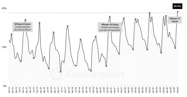 再创纪录!苹果2025年10月全球市场份额攀升至24.2%