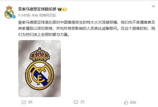 此外,皇家马德里足球俱乐部通过官方微博发布动态,向火灾中的遇难者及家属致哀:"皇家马德里足球俱乐部对中国香港发生的特大火灾深感悲痛,我们向不幸遇难者及其家属致以深切哀悼,并向所有受影响的人员表达诚挚慰问。在这个艰难时刻,我们为他们送上全部的爱与力量。 u200bu200bu200b"