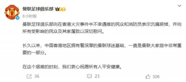 英超联赛的曼联、切尔西和利物浦俱乐部也相继在官方微博发声。曼联俱乐部表示:"曼联足球俱乐部向在香港火灾事件中不幸遇难的民众和消防员表示沉痛哀悼,并向所有受影响的民众及其家属致以深切慰问。长久以来,中国香港地区拥有深厚的曼联球迷基础,一直是曼联大家庭中非常重要的一部分。在这个艰难的时刻,我们衷心祝愿所有人平安健康。"