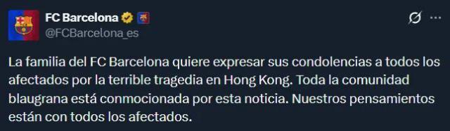 巴萨官方推特发布的内容中,传递出对受灾民众及其家属的深切关怀:"巴塞罗那俱乐部全体成员,向在中国香港这场可怕悲剧里所有受影响的人们致以哀悼。巴萨整个大家庭都为这一消息感到震惊,我们的心与所有受影响的家庭紧紧相连。"