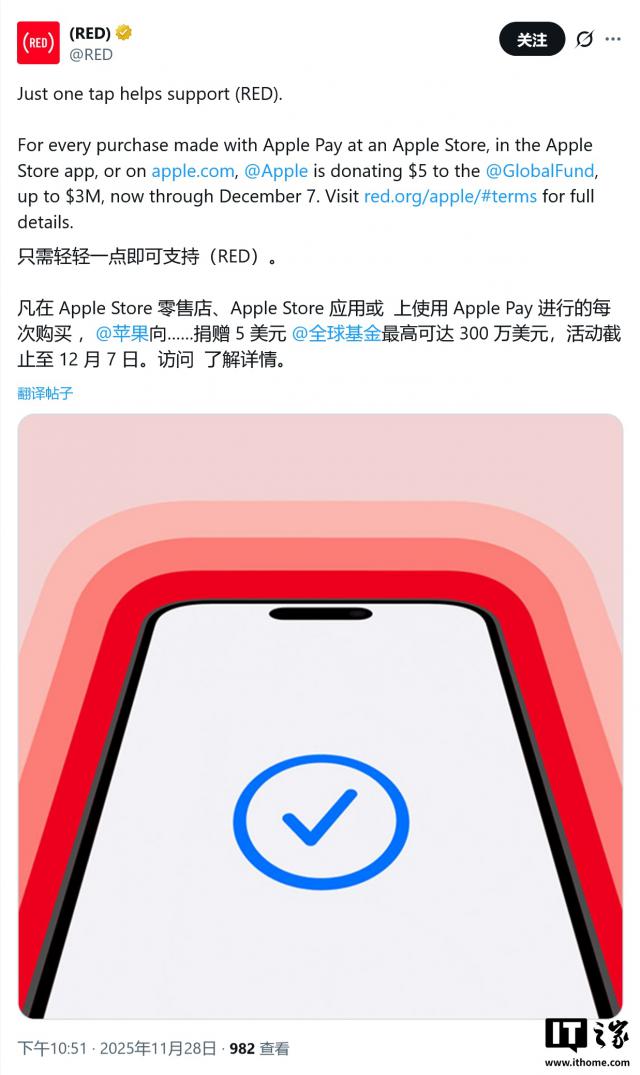 携手(RED)再启公益:苹果19年筹款超2.7亿,2025世界艾滋病日推Apple Pay捐赠活动