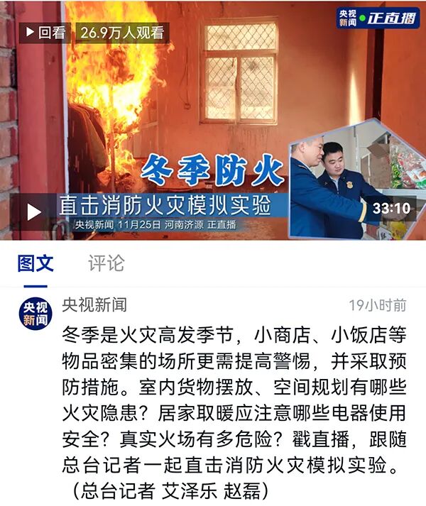 济源消防在央视新闻客户端开启冬季防火专题直播。直播采用实景实验、互动答疑等形式,直观展示火灾隐患的危害,吸引26.6万人次在线观看学习。