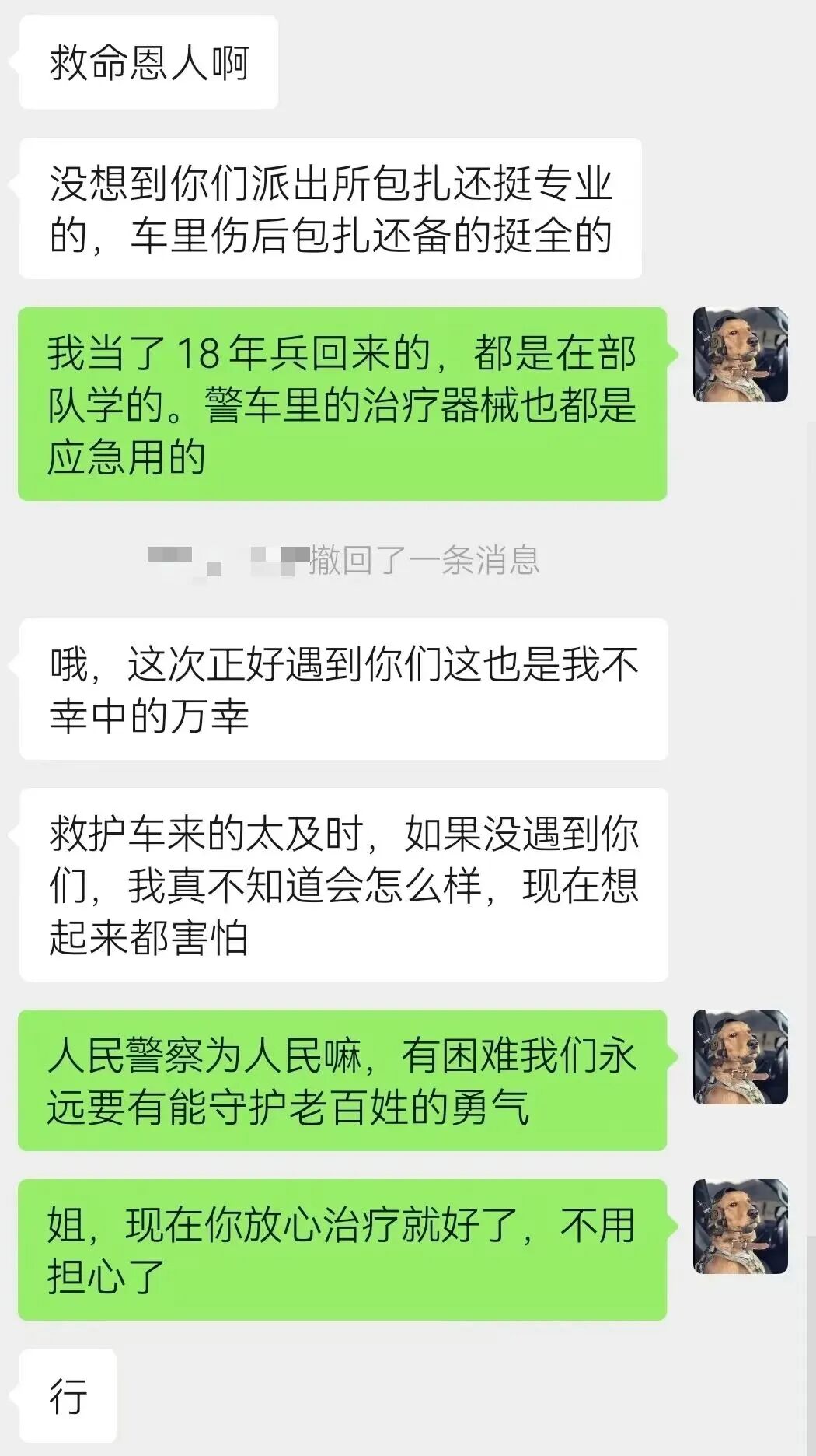 次日凌晨4点,刚做完手术的张女士,第一件事就是添加张磊的微信,真诚地说:“真没想到您包扎得这么专业,警车里的急救物品也这么全!太感谢您了!”