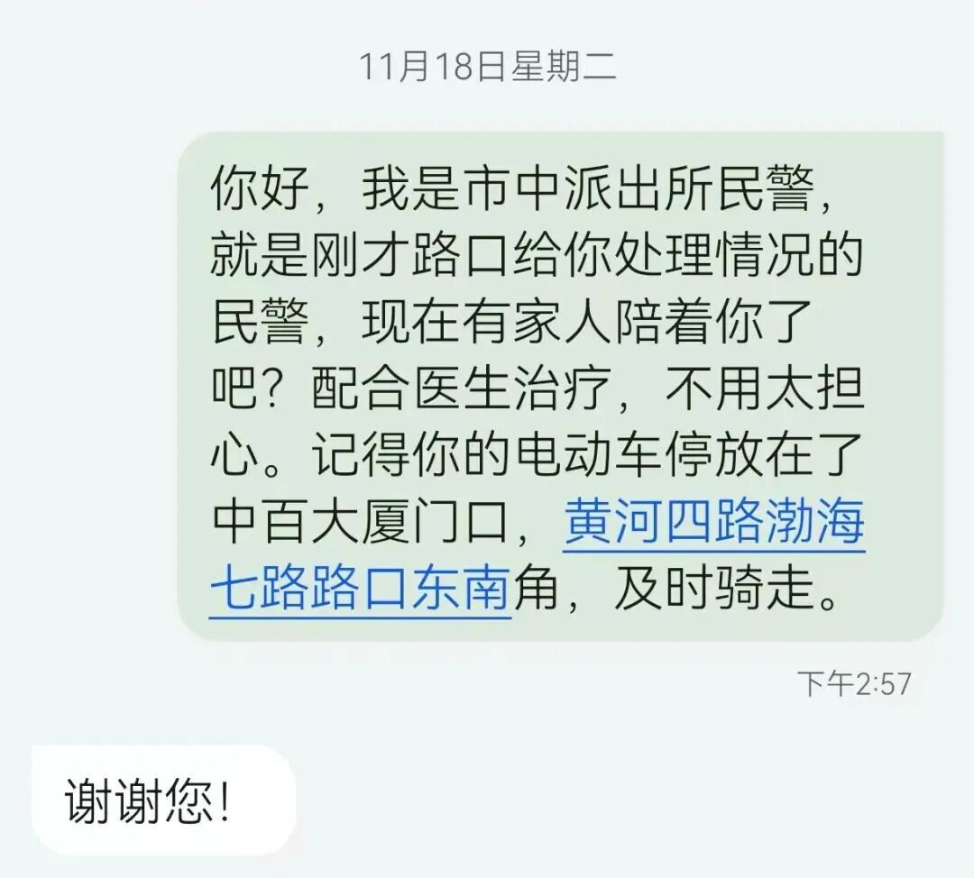 张女士在医院接受治疗时,收到了张磊发来的短信:“现在有家人陪着你吗?好好配合医生治疗,别太担心。你的电动车停在黄河四路渤海七路路口东南角,记得及时去取。”这条细致的提醒,让遭遇意外的张女士心里暖暖的。