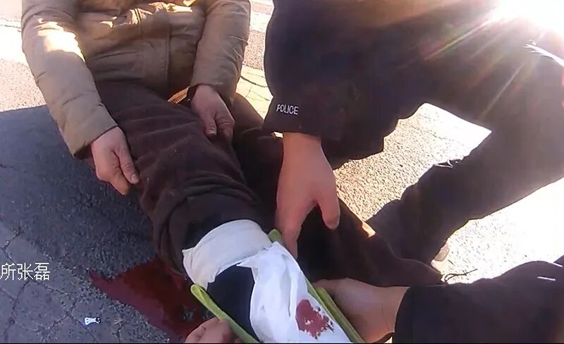 曾在部队服役18年的张磊,凭借丰富的急救经验,一眼判断“大概率是开放性骨折”。他迅速从警车里拿出急救用品,单膝跪地,用绷带为张女士止血,再用夹板固定伤腿,一系列专业操作很快控制住了伤势。