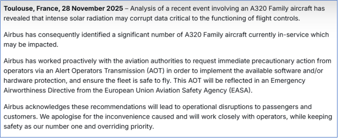空客已经和航空监管机构展开合作,发布了《紧急运营商通告》(AOT),要求运营商马上采取预防性措施,落实可用的软件和/或硬件防护手段,保障机队能够安全飞行。