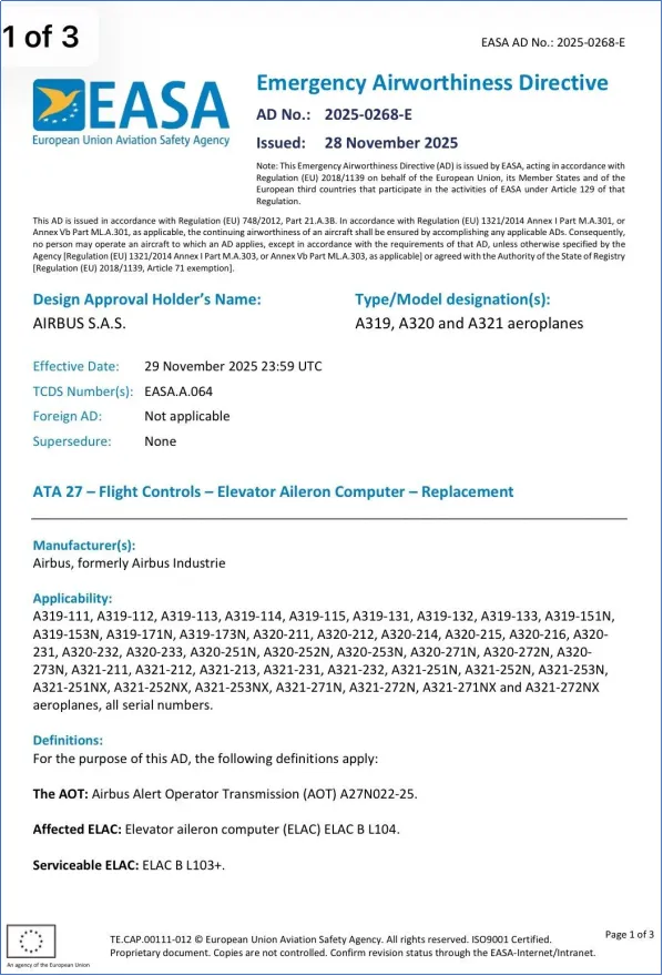 欧洲航空安全局(EASA)也发布了紧急适航指令,要求对A320系列飞机的相关软件进行更新替换。