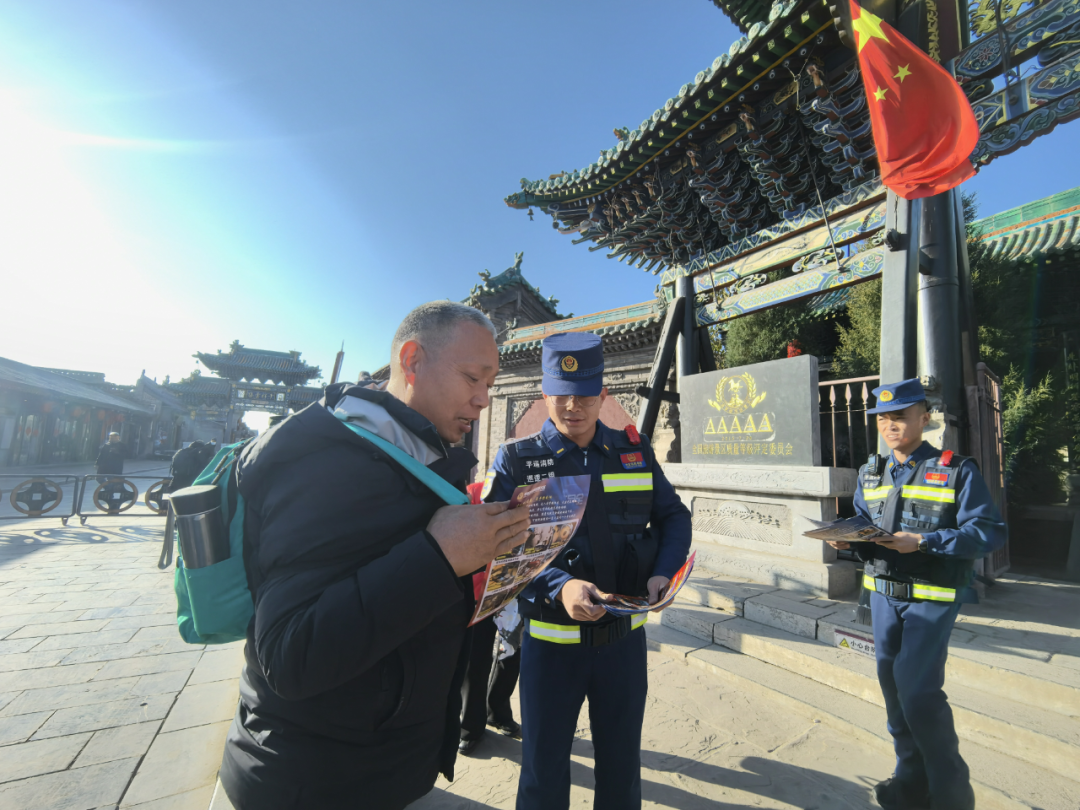 在晋中平遥古城,消防宣传人员与志愿者合作,走进古城核心区域的商铺和客栈,开展面对面的宣传检查活动。
