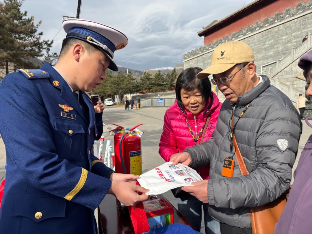 宣传人员结合国内文物古建火灾案例,向游客详细讲解了古建区域用火用电规范、祭祀活动防火要点、初起火灾扑救及疏散逃生方法,让大家认识到古建筑防火的特殊性和重要性。