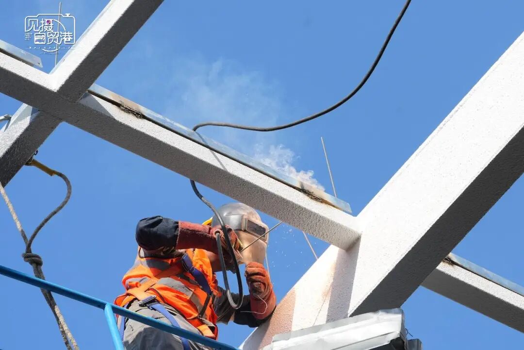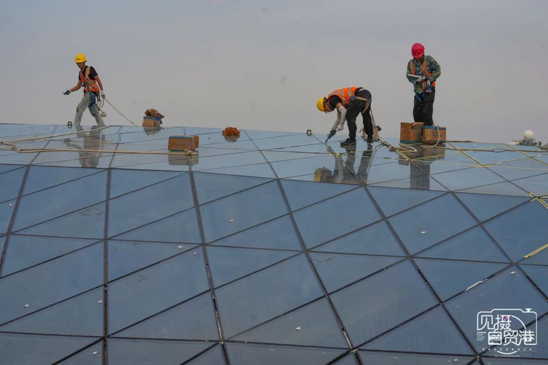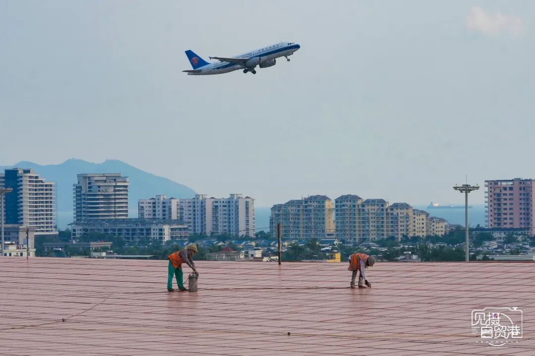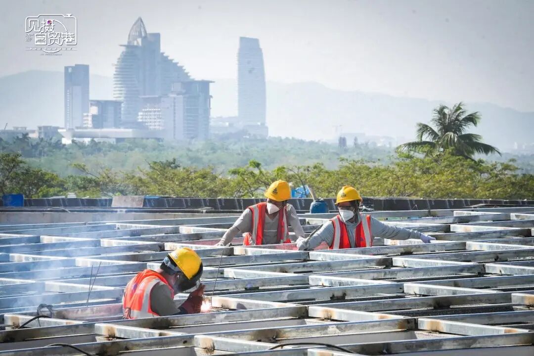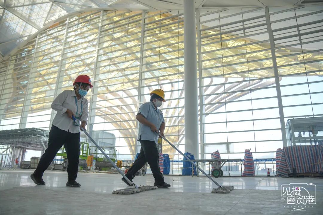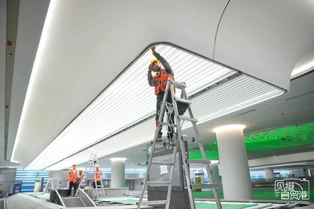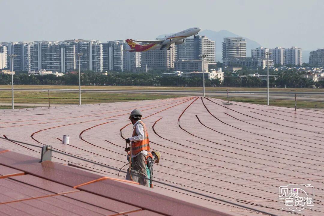 11月25日,三亚凤凰国际机场三期项目T3航站楼的施工现场一片繁忙,工人们正专注地进行设备组装、室内环境清洁以及屋面板安装收尾等工作。