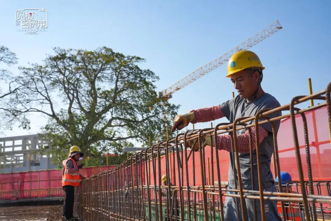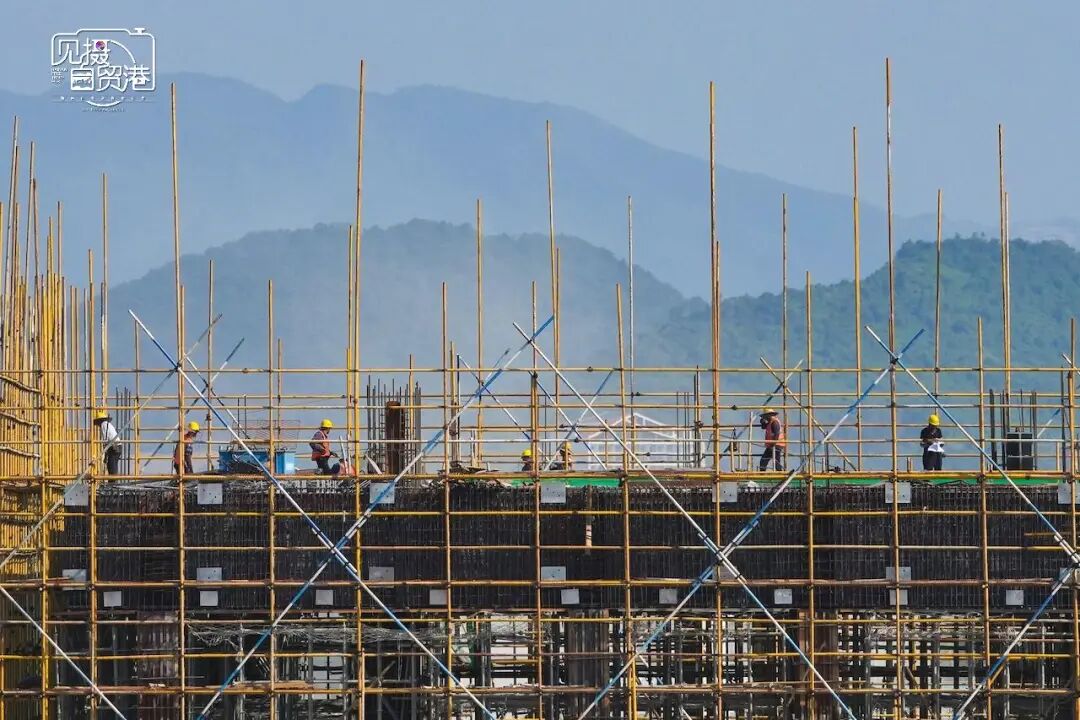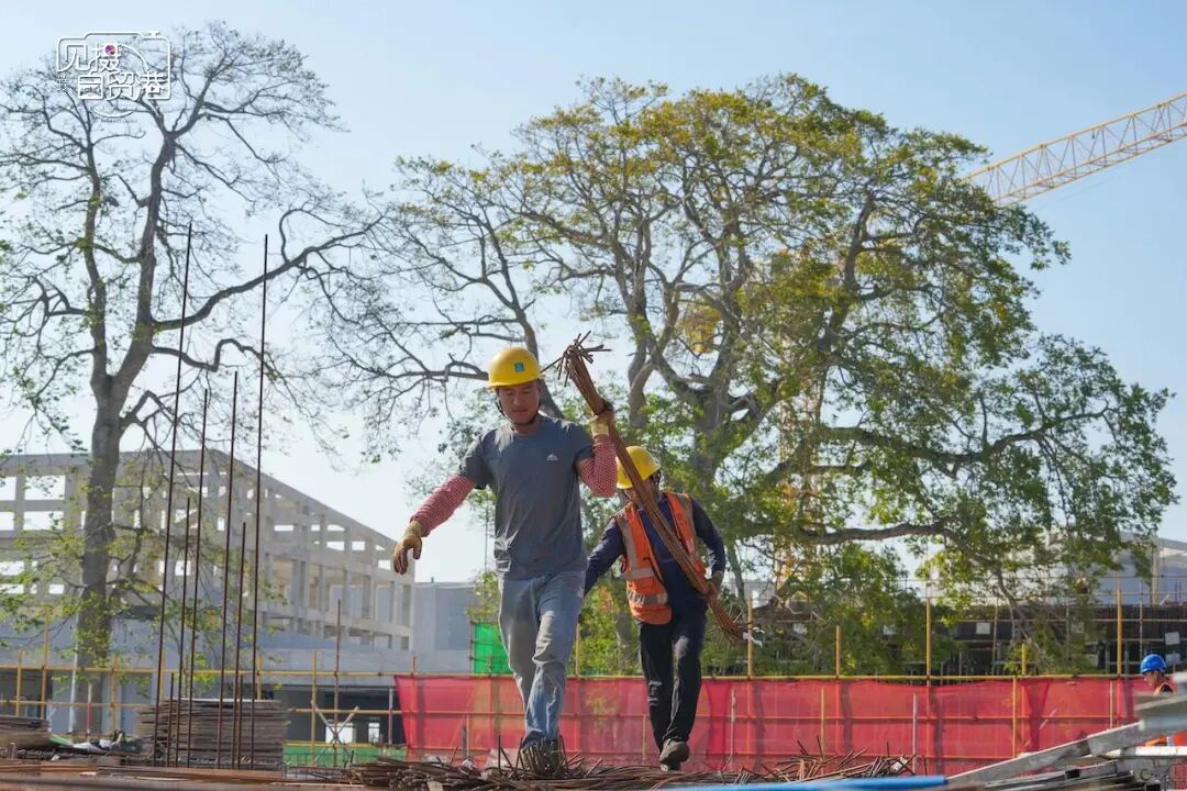11月26日,中建二局负责建设的三亚国际免税城三期项目工地上,工人们坚守岗位,加快推进工程建设。