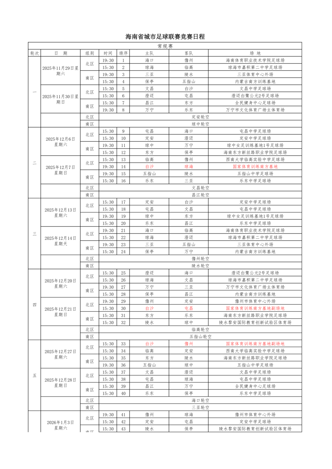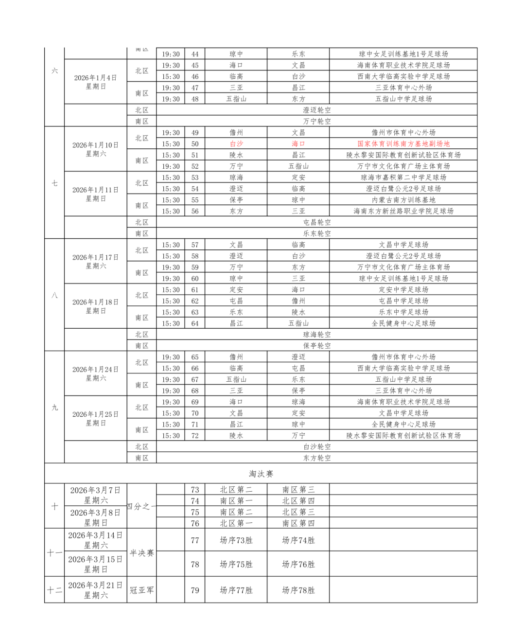 第一届海南省城市足球联赛竞赛日程表