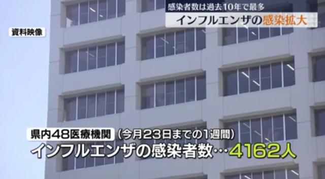 根据福岛县政府11月26日发布的《传染病趋势监测周报》,在11月17日至23日期间,当地48家医疗机构上报的流感感染病例数为4162例,较前一周增加了1300多例。这是当地感染人数连续第八周增长,已远超警戒标准,同时也是2015年以来的最高数值。
