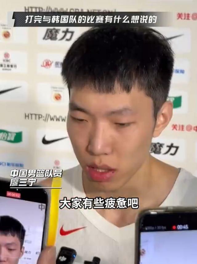 赛后廖三宁的采访依旧条理清晰:"我觉得大家可能还是存在一些轻敌的情绪,对比赛中可能出现的困难准备不够充分,防守强度也给得不足,让对手的外线能够轻松出手。这场比赛我们的防守强度比亚洲杯时差了很多。"