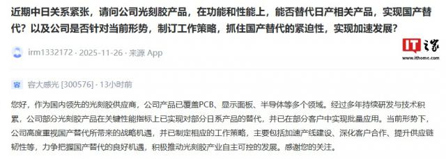 IT之家11月29日消息,深圳市容大感光科技股份有限公司(以下简称“容大感光”)于11月28日通过互动平台对外披露,经过多年在技术研发领域的持续投入与经验积累,公司旗下部分光刻胶产品的关键性能指标已成功实现对部分日系同类产品的替代,且相关产品已在部分合作客户中进入批量应用阶段。