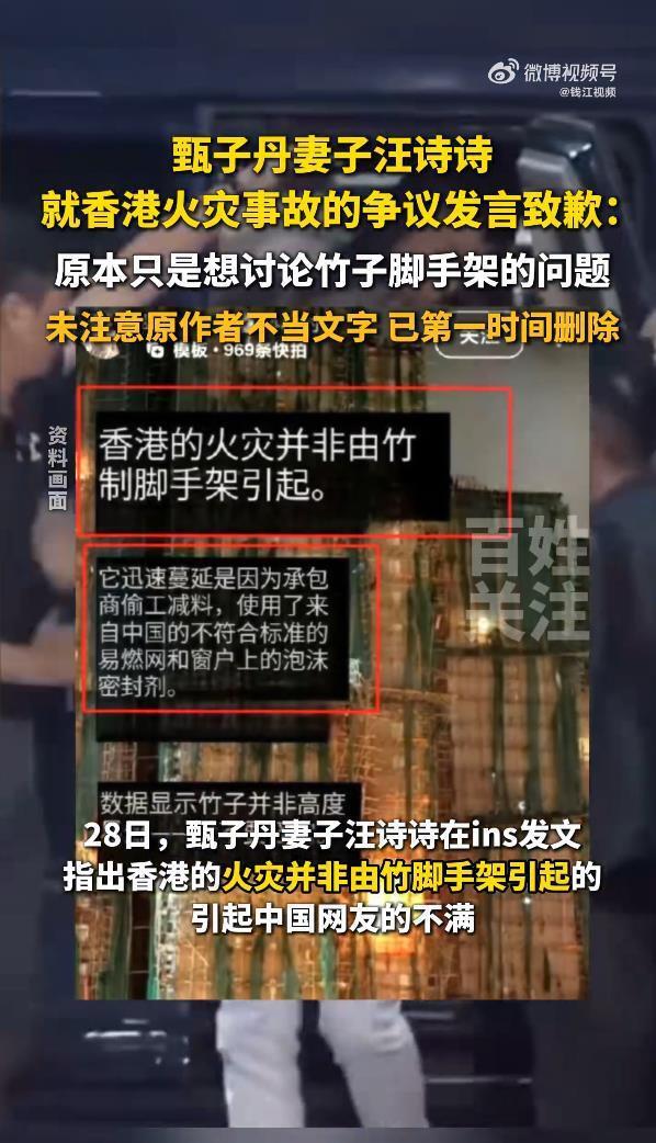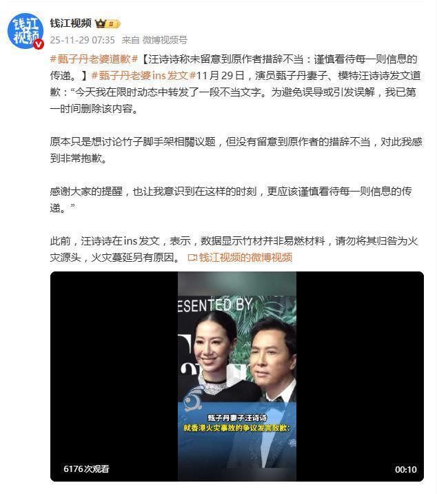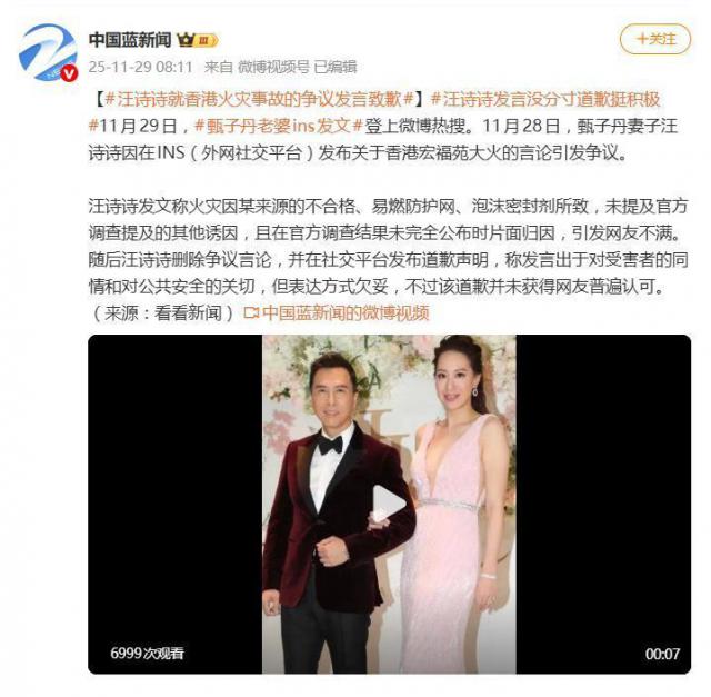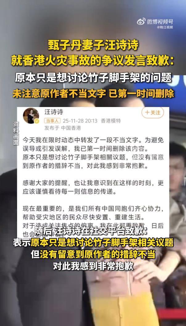 11月29日,演员甄子丹的妻子、模特汪诗诗在社交平台发布道歉内容,相关话题迅速登上热搜,引发众多网友关注。此次风波的导火索,是她此前针对香港宏福苑火灾发表的一段引发争议的言论。