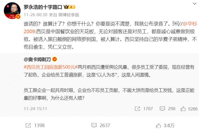 罗永浩此前曾批评西贝预制菜,近日华与华创始人华杉发文声援西贝,称其是餐饮业天花板,遭“算计”。罗永浩转发要求公开道歉,引发热议。