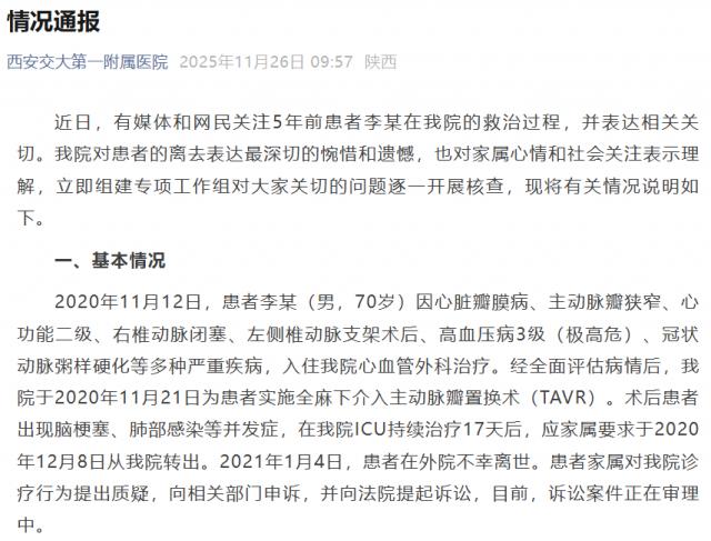 11月26日,处于舆论焦点的西安交通大学第一附属医院,就外界质疑的“过度医疗”“违规医保”等问题发布声明。