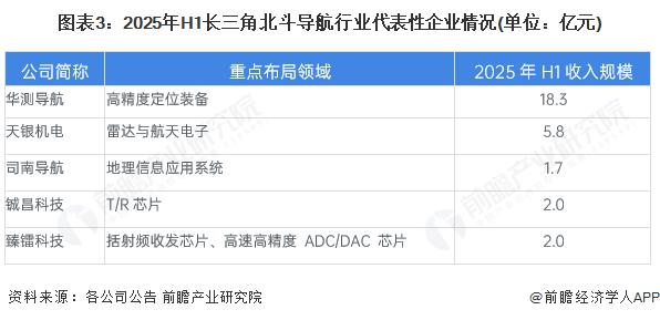 历经多年发展,长三角已培育出华测导航、天银机电等一批北斗导航行业代表性企业,产业布局覆盖芯片、导航系统等领域。2025年上半年,华测导航与天银机电营收均超5亿元,企业规模优势显著。