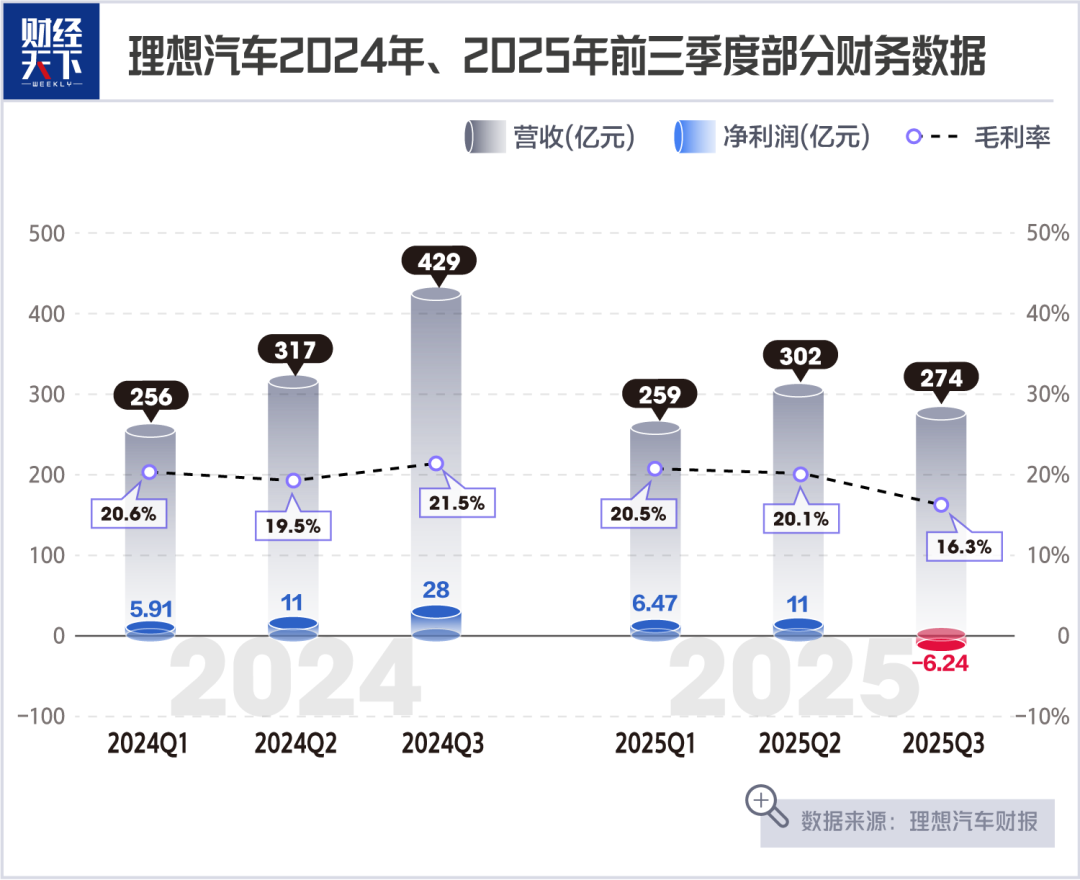 2025年第三季度,曾连续11个季度盈利的理想汽车遭遇业绩滑铁卢。财报显示,公司总收入274亿元,同比减少36.2%;车辆销售收入259亿元,同比下滑37.4%;净亏损6.24亿元,上年同期盈利28亿元。车辆毛利率和整体毛利率分别降至15.5%和16.3%,同比下降5.4和5.2个百分点。理想汽车解释称,毛利率下滑受MEGA召回影响,剔除该因素后毛利率分别为19.8%和20.4%。交付量方面,第三季度交付93211辆,同比减少39.0%;前三季度累计交付29.7万辆,同比下降13.2%。