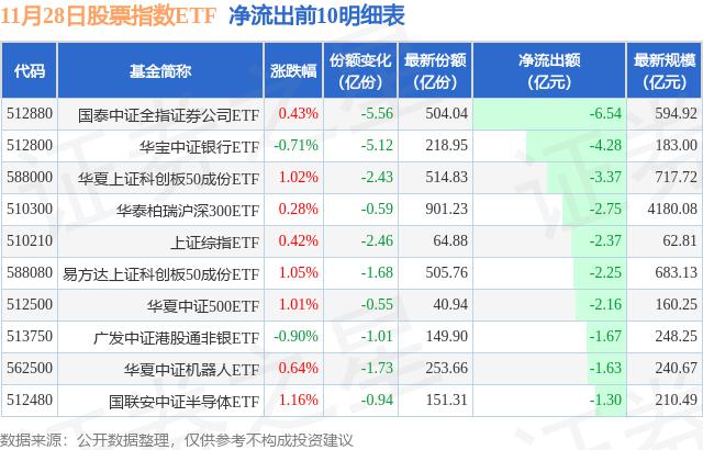 当日有232只股票指数ETF出现资金净流出,国泰中证全指证券公司ETF(512880)的资金净流出额居首,份额减少了5.56亿份,净流出金额为6.54亿元。
