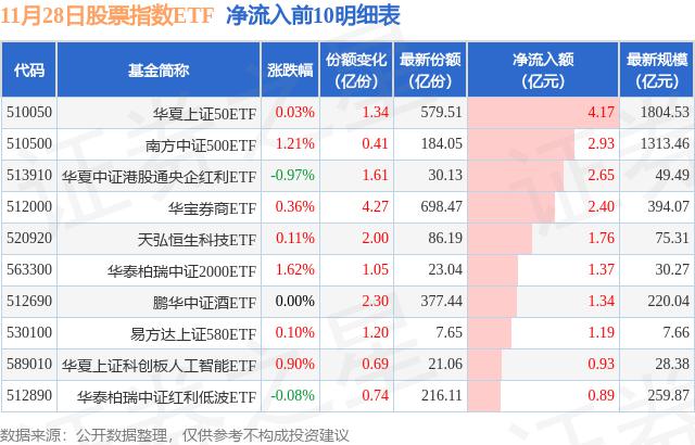 当日共有130只股票指数ETF实现资金净流入,其中华夏上证50ETF(510050)的资金净流入额最高,份额增加了1.34亿份,净流入金额达4.17亿元。