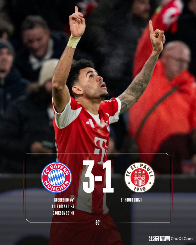 德甲-拜仁3-1逆转圣保利 迪亚斯传射建功格雷罗杰克逊破门