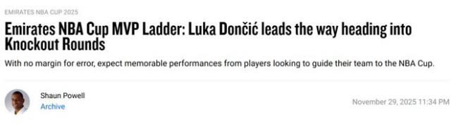 NBA杯MVP榜单出炉:东契奇居首亚历山大次之 里夫斯第四詹姆斯落榜
