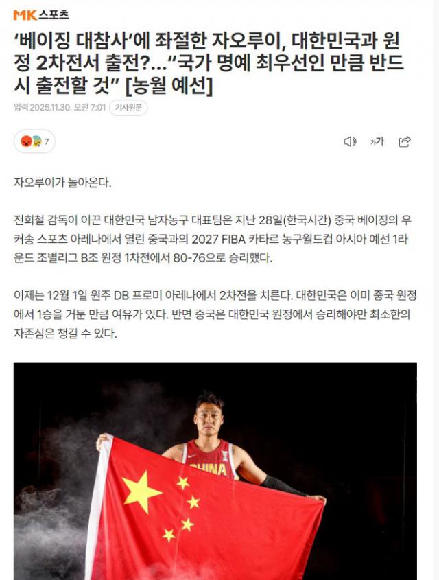 北京时间11月30日,韩国媒体《MK新闻》发文称:经历北京失利的赵睿,大概率会在对阵韩国男篮的第二场比赛中复出,他将国家荣誉置于首位。