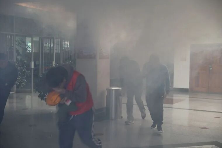模拟烟雾升起时,工作人员引导居民:“别慌!捂住口鼻,弯腰低姿,有序撤离!”居民们参与应急疏散演练和灭火实操。