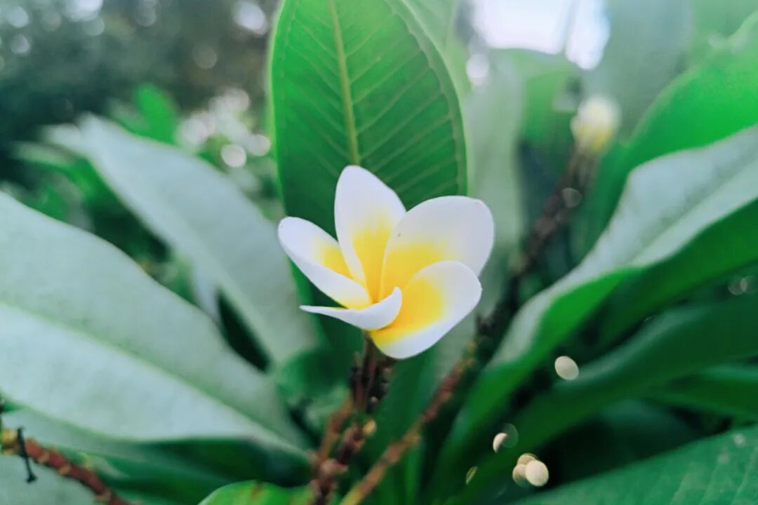 洁白的鸡蛋花苞悄然绽于枝头,在绿叶簇拥下向着阳光舒展。恰似初入警营的我们,崭新藏蓝警服裹着青涩却纯粹的热忱,眼中满是对职业的憧憬。