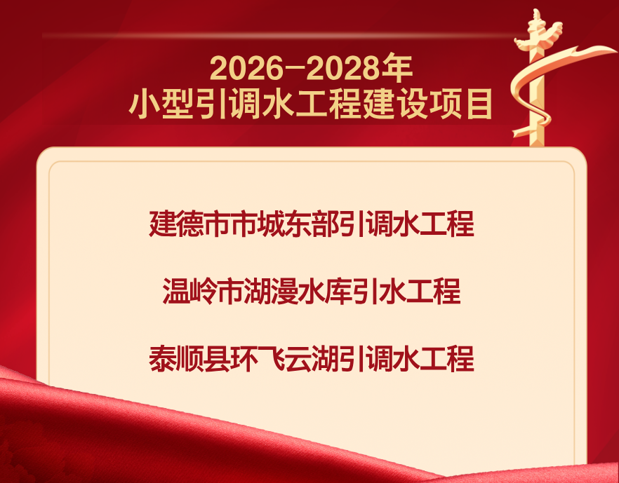 近日,浙江省建德市、温岭市、泰顺县成功入选2026-2028年小型引调水工程建设项目名单,每个项目可获中央补助资金约8000万元。