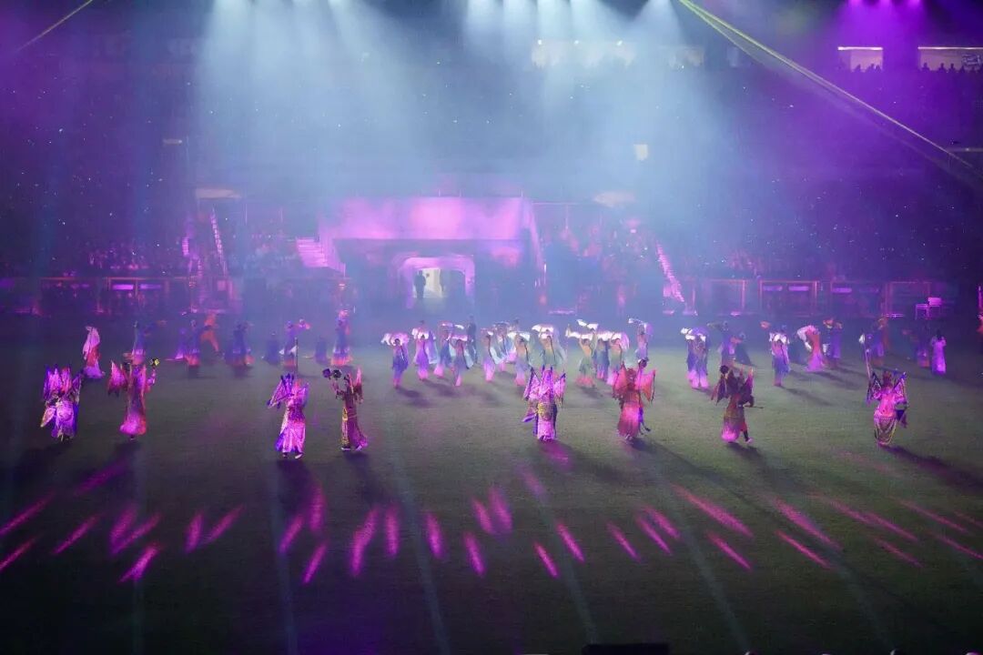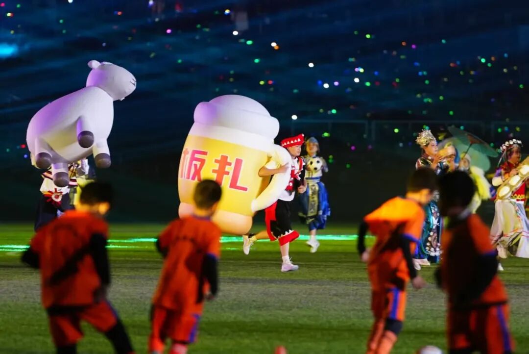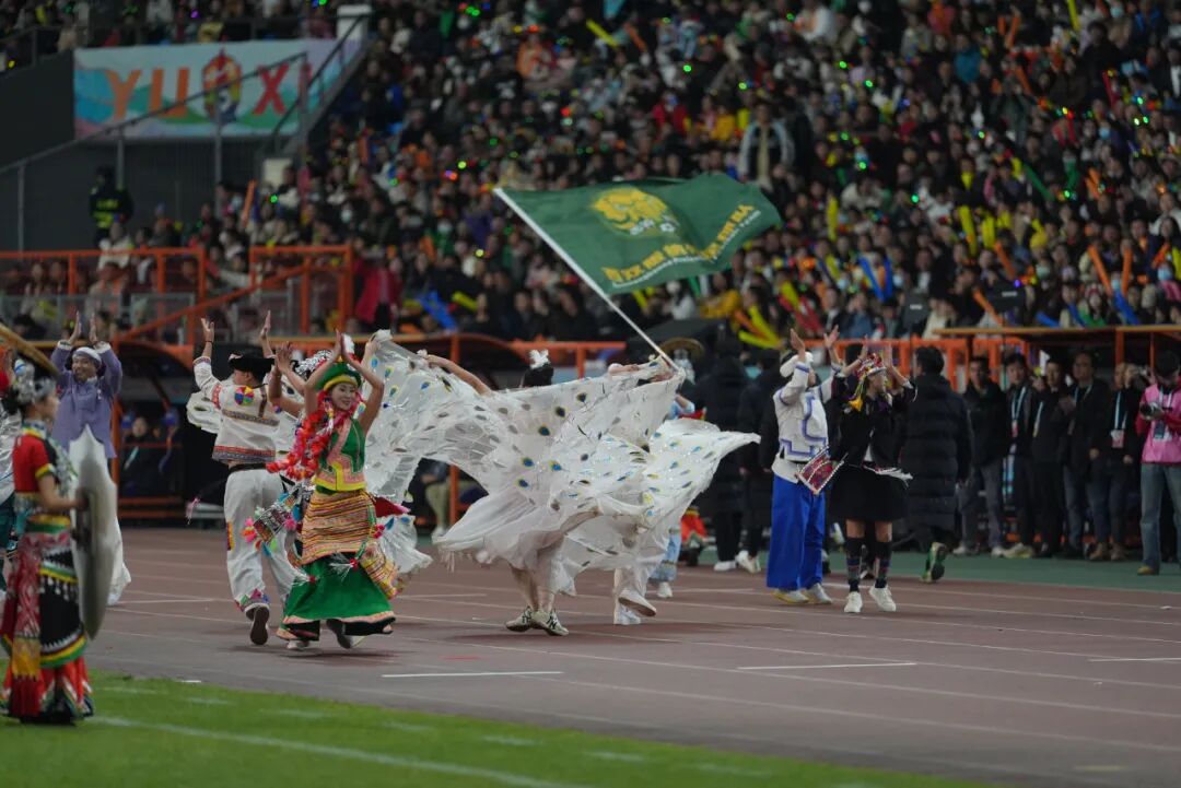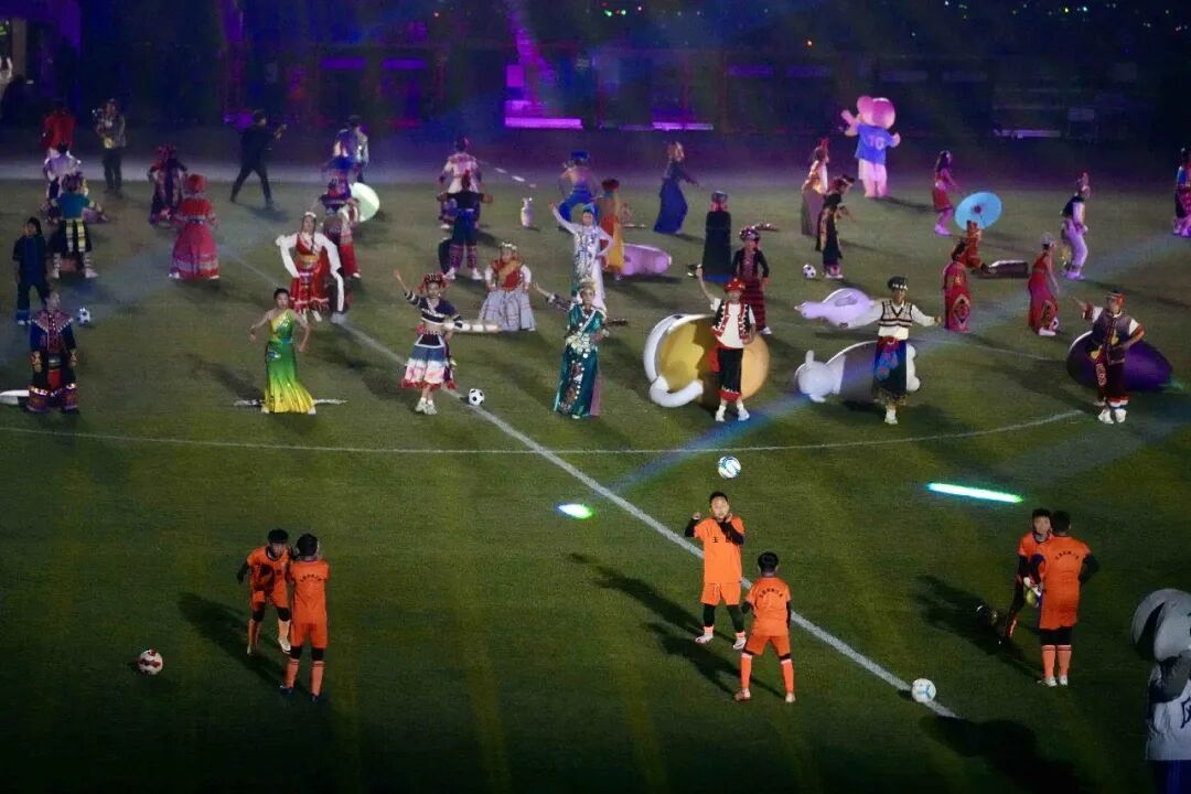 开幕式以大型激光秀《绿茵风云动 足梦彩云南》拉开序幕,激光在夜空中交织出震撼画面:从寒武纪生命起源到元谋人火种文明,从古滇青铜的璀璨到今日云南的多元繁荣,生动展现了云岭大地的历史底蕴与现代活力。