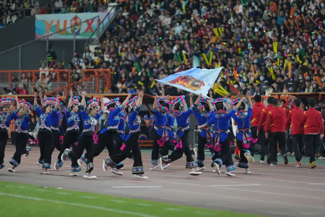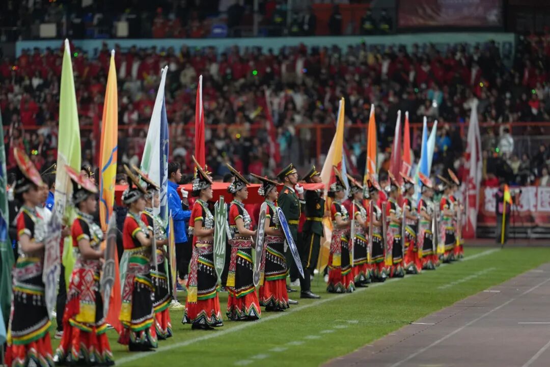 仪式环节中,武警玉溪支队组成的国旗、会旗方阵迈着铿锵步伐入场,全场起立致敬。裁判员方队及16个州(市)代表队依次亮相,展现云南足球的蓬勃力量。