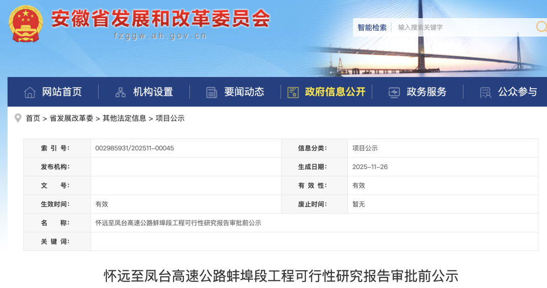 怀远至凤台高速公路蚌埠段工程可行性研究报告审批前公示