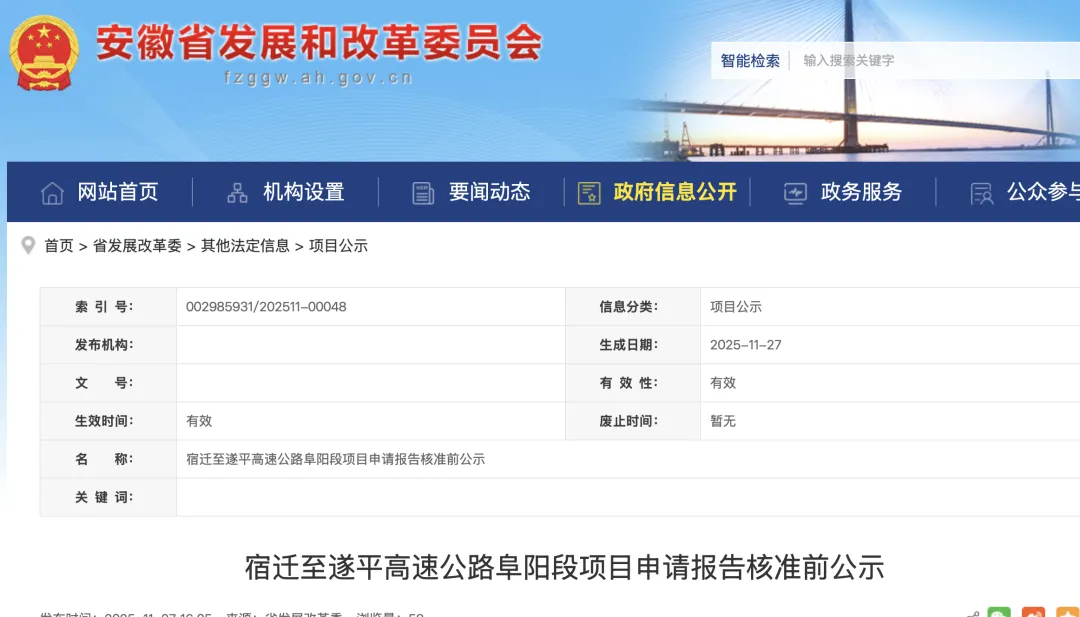 宿迁至遂平高速公路阜阳段项目申请报告核准前公示