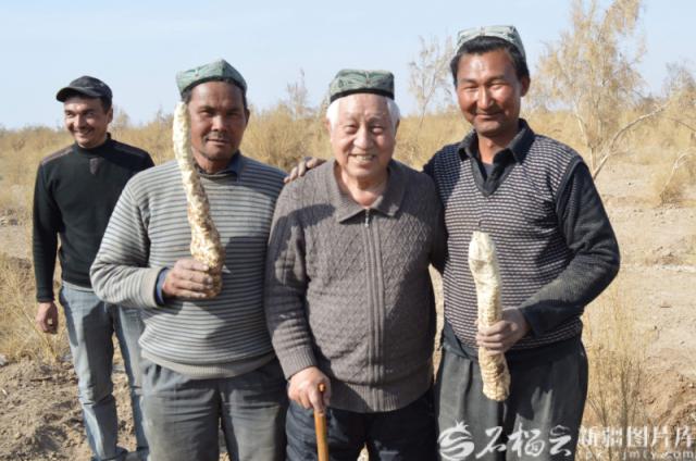 2016年刘铭庭(中)和种植肉苁蓉的群众合影。新疆图片库供图