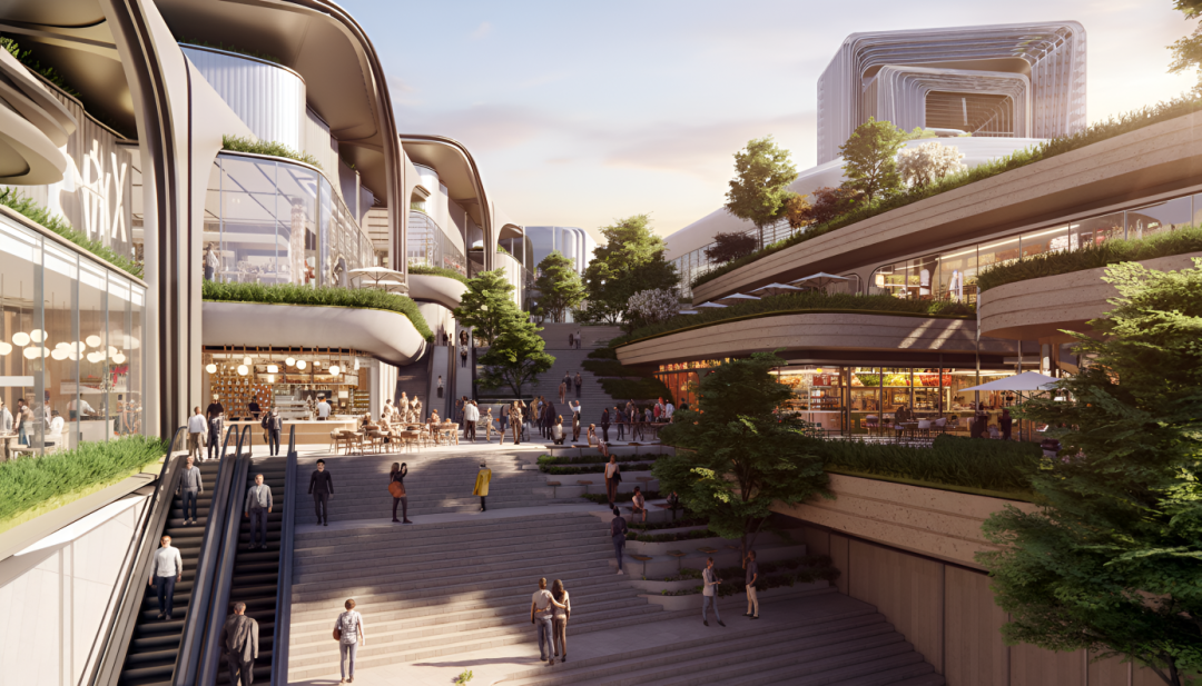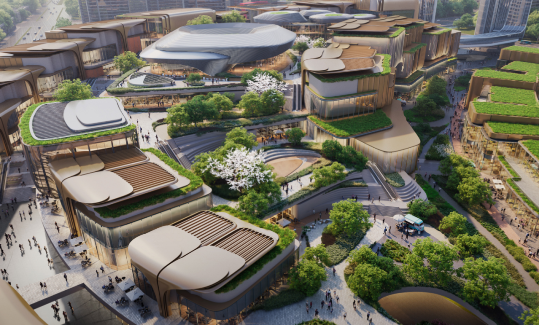 更让人惊喜的是,这个商业综合体里还将打造一座“3D”立体市民公园——“超级绿芯”。它将打破传统商业空间的封闭感,就像是把商业楼栋变成了一个“可以漫步的空中花园”,例如采用退台式设计,让建筑逐层形成“露台花园”,市民逛街时仿佛身处公园里,满眼都是绿色。